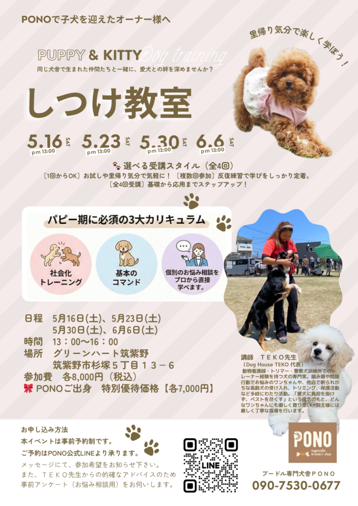 また、今回はPONO出身のワンちゃんだけでなく、他店出身のワンちゃんもご参加いただけますので、多頭飼いの方はご一緒にご参加下さい。